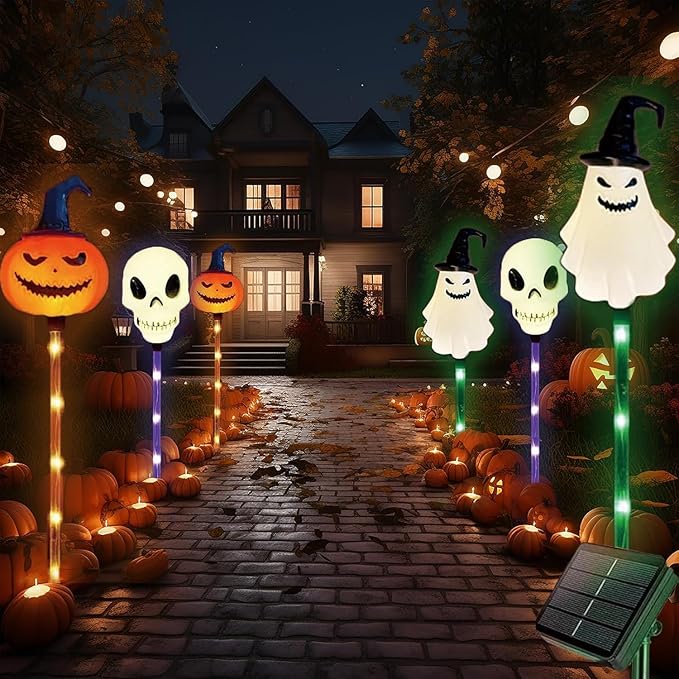 【ユニークなハロウィン装飾】2025年新モデルハロウィン 飾り ライト登場!特別な3Dカボチャ、髑髏と幽霊のデザインで、ヘッドだけでなく棒もきらきらと光ります。フェスティバルや不気味なハロウィンパーティーの雰囲気を演出します。カボチャ、髑髏と幽霊が6個セット、全長は約2.6M、小道や芝生、庭、ガーデンなどを飾ることができます。
