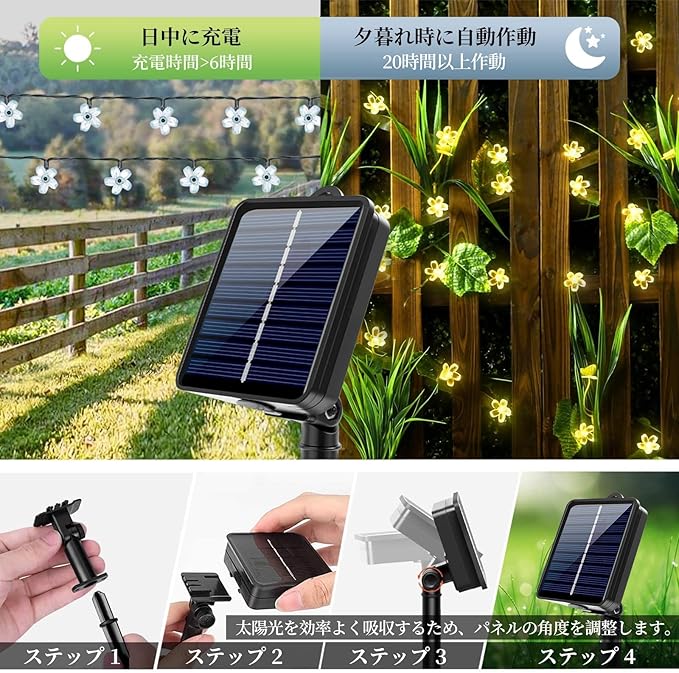 【パッケージ内容&サポート】1x50LEDソーラー桜ストリングライト、1xグラウンドステーク、1xソーラーパネル、1x説明書。ご購入日より1年間は初期不良や通常使用などで故障した場合に代替え品もしくは返金にて保証いたします。ご購入いただいた商品にご満足できない場合は、お気軽にお問い合わせください。安心の12ヶ月保証つき、万が一、初期不良&破損などが起こった場合は、ぜひ「注文履歴」→「出品者に連絡」から弊店までにご連絡ください(★商品の交換・返品サービス★など対応できます)