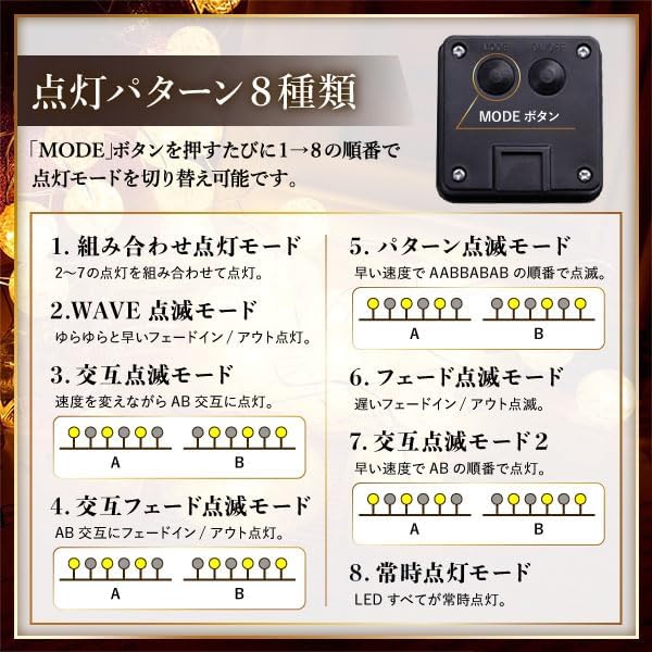 サイズ:コード長さ:約6.5m、ソーラーパネルから最初の電球まで:約2m、電球サイズ:直径約1.8cm、電球間隔:約15cm