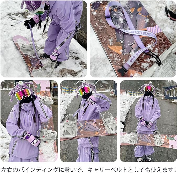 【こんな使い方も便利】左右のバインディングに繋いで、キャリーベルトにすれば、移動時にボードをさっと背負えるのが便利です!