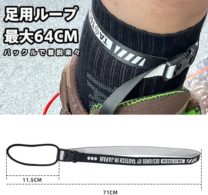 【ポイント】足の部分にバックル付きで着脱がしやすい設計。アジャスター付きで足用ループの大きさを調節できます。全長:約71cm、バインディング用ループ:約11.5cm