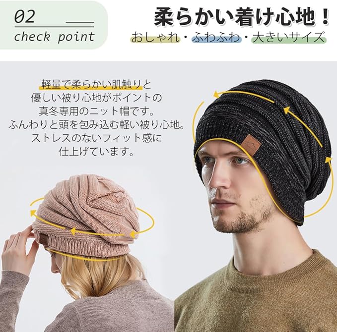 【快適・柔らかい】軽量で柔らかい肌触りと優しい被り心地がポイントの真冬専用のニット帽です。ふんわりと頭を包み込む軽い被り心地。ストレスのないフィット感に仕上げています。長時間かぶっても、窮屈感もなく、ゆったりとかぶれるサイズ感。