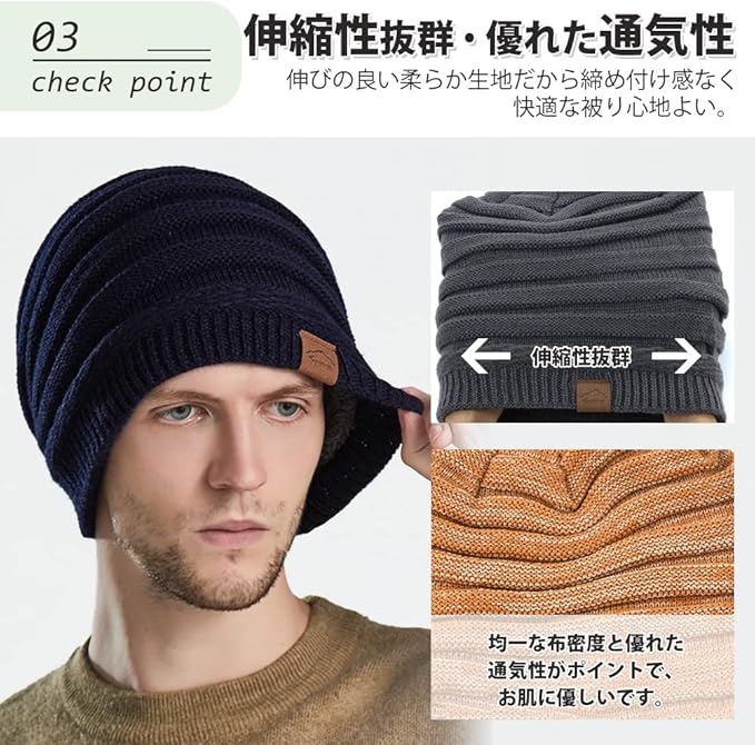 【二重構造・究極の防寒】軽量で保温性に優れた、伸縮素材も防寒も抜群のニット帽です。生地を二重の厚さにするので、裏側がふわふわ起毛素材を加工して、保温性を高めています。柔らかくて通気性も抜群!頭、耳を冷たい風から守り、冬に欠かせない防寒グッズです!