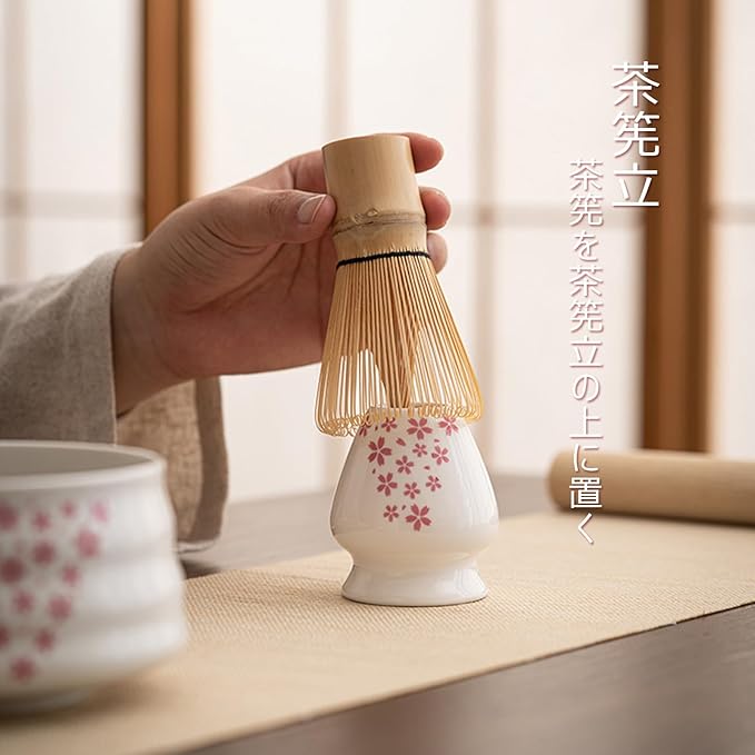 【4点セット内容】1*竹茶筅(茶筅)百本立、1*茶匙(茶杓)、1*注ぎ口付き陶器抹茶茶碗(茶わん)、1*陶器茶筅スタンド。 初心者向けの抹茶道具を豊富に取り揃えております。