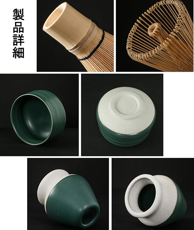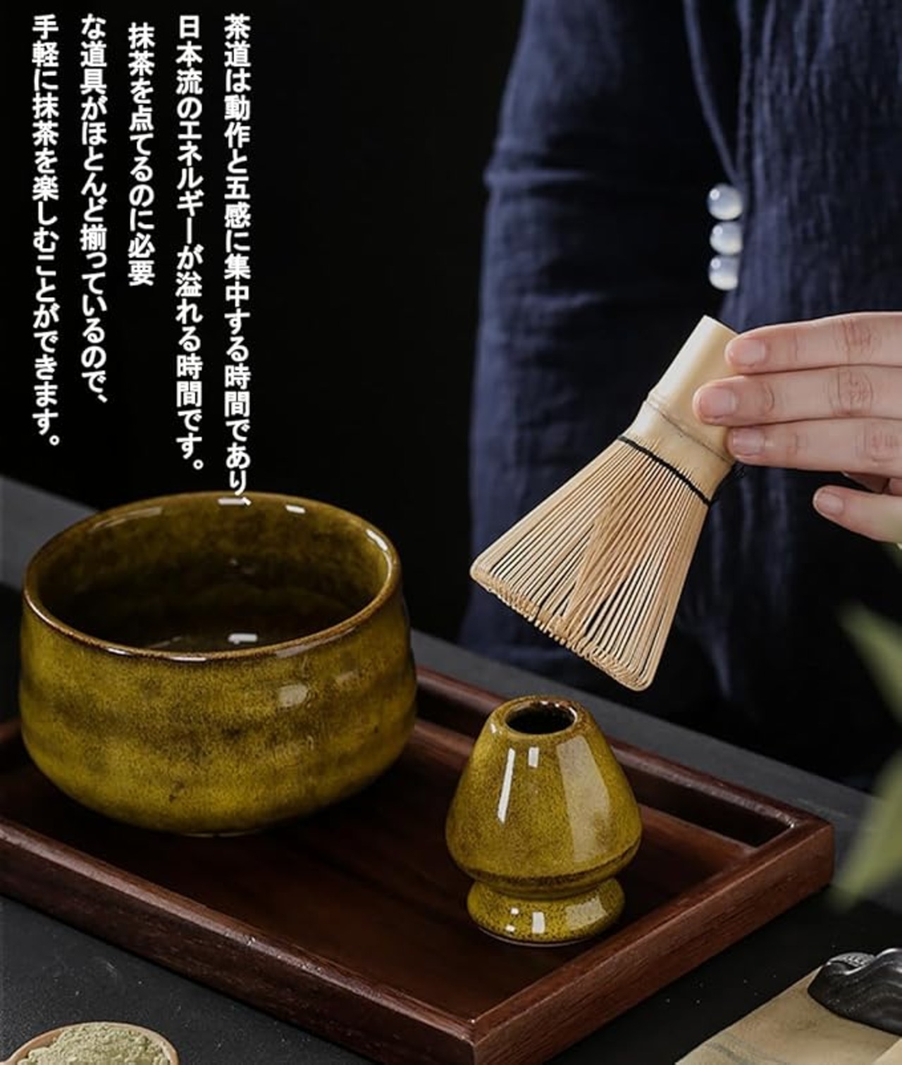 【4点セット内容】1*竹茶筅(茶筅)100本、1*茶匙(茶杓)、1*注ぎ口付き陶器抹茶茶碗(茶わん)430ml、1*陶器茶筅スタンド。 初心者向けの抹茶道具を豊富に取り揃えております。