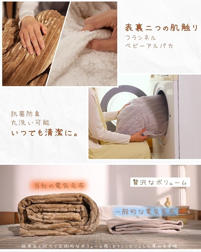 【188 130cmのサイズで包まれる、もっちりふわふわの極上感触、もこもこ電気掛け敷き毛布】 長毛を立たせる特殊加工により、ふんわりながらもボリューム感のある肌触りを実現。身体を包み込むと離したくない、心地よい温もりが続きます。単なる毛布や電気ひざ掛けとしてだけでなく、電気敷毛布として、あるいはベストやスカート、ポンチョのように身にまとって──多彩なスタイルで、優しい温かさとともにあるくつろぎの時間をお届けします。乾燥しがちな冬場もご安心を。静電気防止加工によりパチパチ感を抑制し、ホコリの付着も軽減。洗濯機での丸洗いにも対応しているため、清潔を保ちながら長くお使いいただけます。省エネ性能も優秀:弱運転時(電力単価27円/kWh計算)の1時間あたりの消費電力は約2.7円、家計に優しい設計です