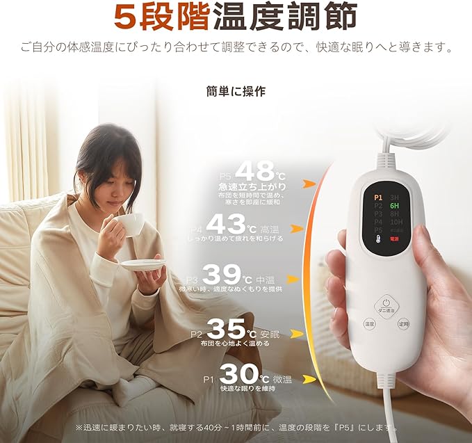 【5段階温度調節】本の掛け敷き兼用電気毛布は5段階の温度調節機能を搭載しています。コントローラーで簡単操作でき、30℃、35℃、39℃、43℃、48℃の5段階からお好みの温度にぴったり合わせて調整できるので、ぐっすり眠れます。また、ふわふわの素材で電熱線も気にならず、体にしっかりフィットします。掛けて使えば、包み込まれるような心地よさを感じられます。