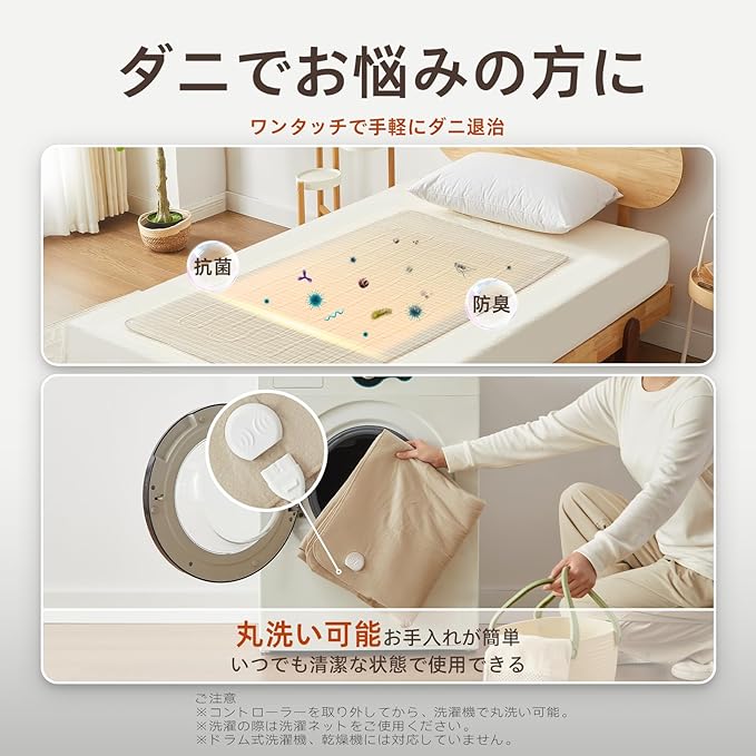 【4段階タイマー&ワンタッチでダニ退治】4段階(3H/6H/8H/10H)の安心タイマー設定で、夜中に暑さで目が覚めたり、わざわざ起きて電源を切ったりする必要がなく、自然な睡眠リズムを守ります。タイマー設定しない場合、6H自動オフの切れ忘れ防止。【ワンタッチでダニ退治】「ダニ退治」ボタンを押すだけで、目安1時間の自動運転が始まります。ダニをしっかり駆除するのはもちろん、除菌と消臭も同時に行います。