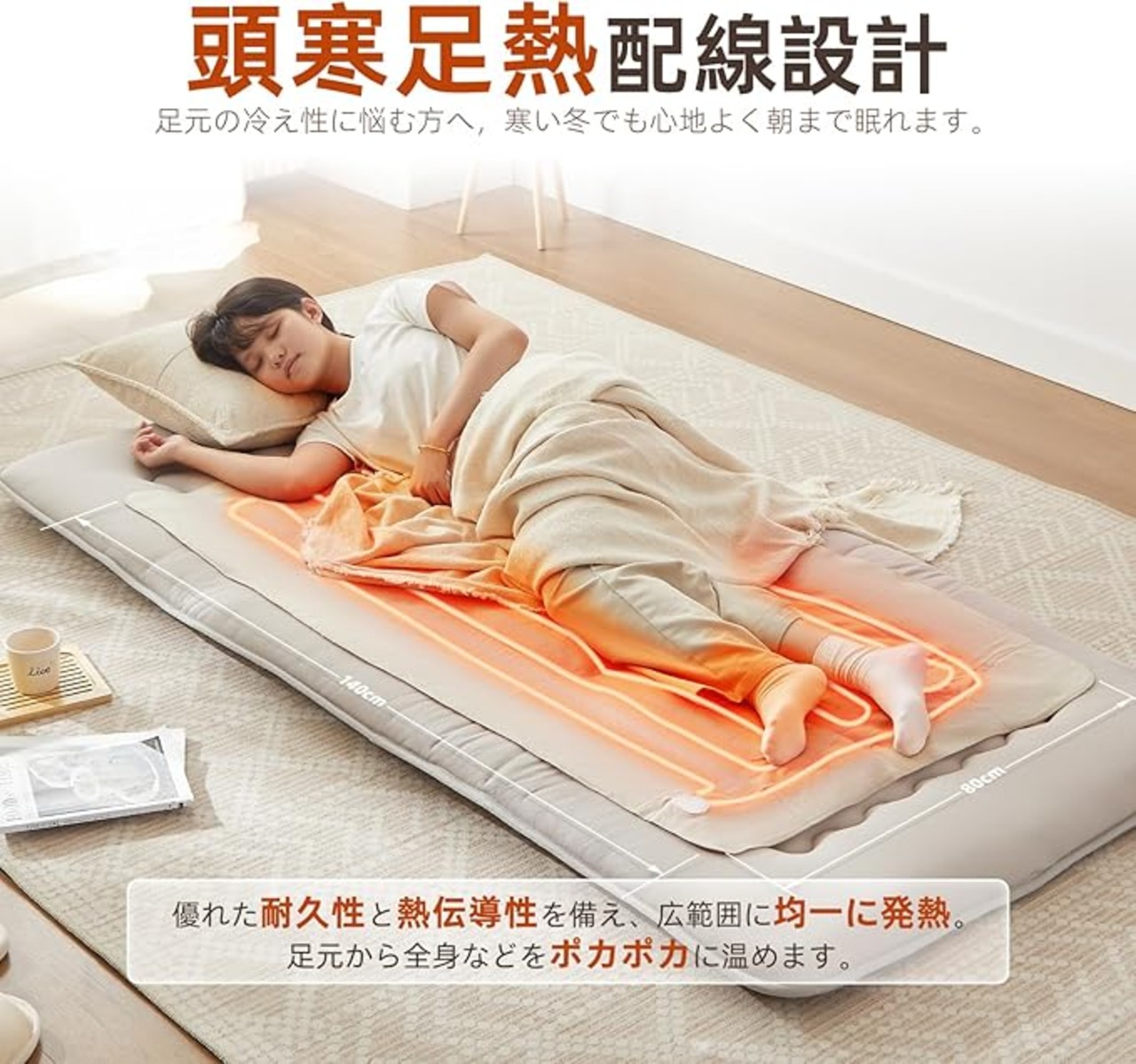 【圧倒的省エネ&頭寒足熱で心地よい眠り】最大消費電力65W、電気料金はわずか(1時間あたり)1.86円。冬の暖房家電として、電気毛布の最大のメリットは電気代を抑えつつしっかりと暖を取れることです。布団や身体を暖めるだけでなくフローリングや畳からの底冷えもしっかりシャットアウトします。【頭寒足熱配線】 頭寒足熱を基本に細かな配慮をした配線設計で、足元を重点的に暖めるため、足元からぽかぽかと、カラダにやさしい暖かさです。足先が冷えてなかなか眠れない方に大変お勧めです。心も体も暖まる、贈り物にもぴったりです。