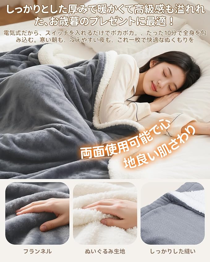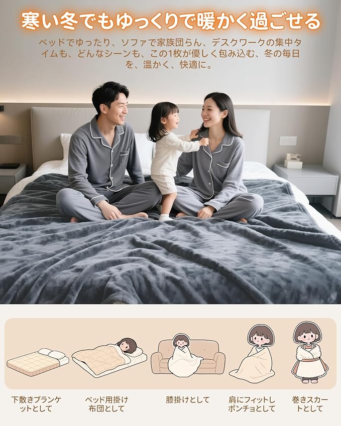「従来品より広い!200 140cmの大型サイズで2人ゆったり」冬の寒さを徹底さよなら電気毛布は業界初の特大サイズ(200 140cm)として登場いたしました。敷布団にも掛け布団にもなる多機能タイプです。従来の小さい電気毛布ではできなかった「共有体験」を価値に変換しましょう。一人で掛けたり敷きたり使えることはもちろん、就寝時、ダブルベッドにも余裕のサイズ!夫婦で一緒に使ってもはみ出す心配なしです、リビングであはソファに広げれば、家族みんなで足元ポカポカ。従来品より約2倍の広さでキャンプのテント内で掛け布団代わりに!従来品では足りなかった足元までしっかり保温くれます。大型両用設計で、あらゆる寒さシーンを快適に変えます!冬の快適ライフを叶える掛け敷き両用電気毛布は冬の暖房器具グッズとして最適、両親、恋人、家族、友達、お子様へのギフトとしてもも最高、掛け敷き兼用かつ節電でこの冬には楽しく過ごしましょう