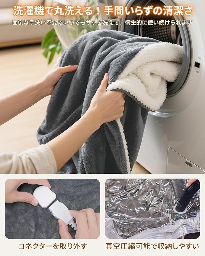 「洗濯機で丸洗える&抗菌除臭&頭寒足熱配線」電気カーペットは、優れたシール性能を持っており、内部の加熱線の損傷を心配する必要はありません。コントローラーを取り外して、家庭の洗濯機で丸洗いや手洗いができます。洗濯試験にも合格しており、安心して洗うことができ、いつでも清潔で衛生的にご利用いただけます。また、高温(50℃)で加熱するとダニが死滅すると言われていますので、温度(50℃)に設定して布団にかけると、ダニを消滅させることができ、電気膝かけを常に清潔に保ち、毎年冬に再利用することもできます。経済的で素晴らしい選択です。(※ドラム式洗濯機や乾燥機には対応していません)