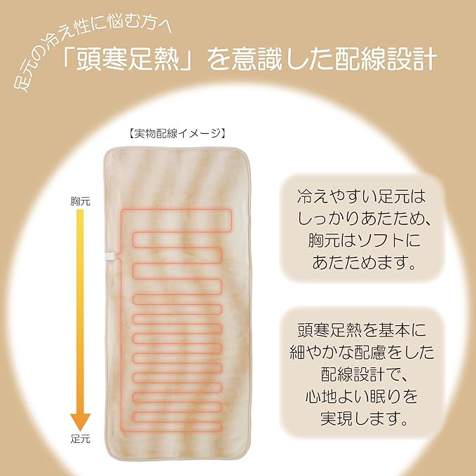 表面アクリル100%、頭寒足熱配線、室温センサー、抗菌防臭加工、ダニ退治機能、洗える毛布