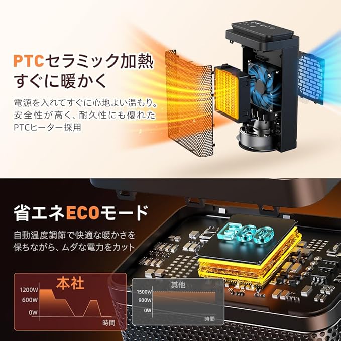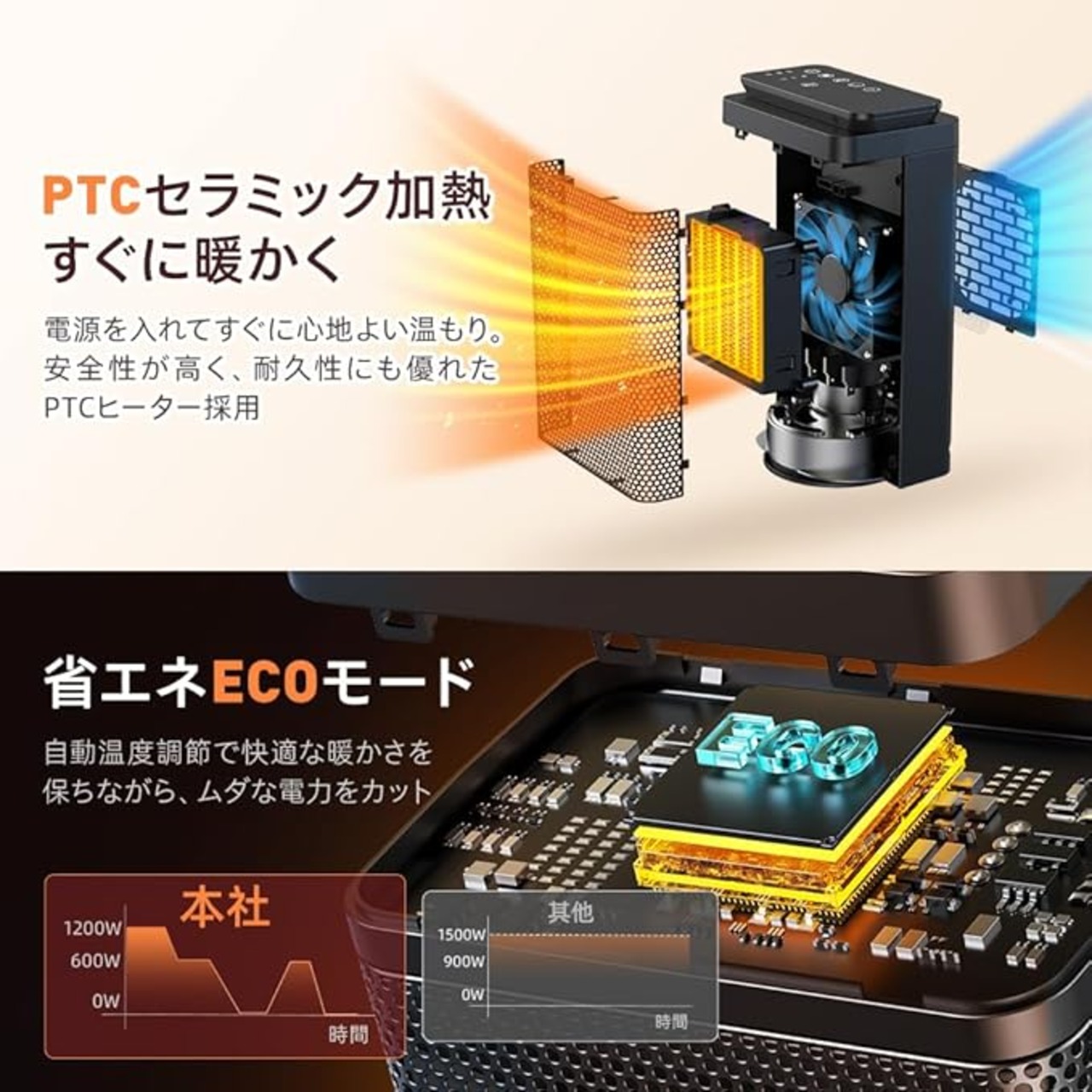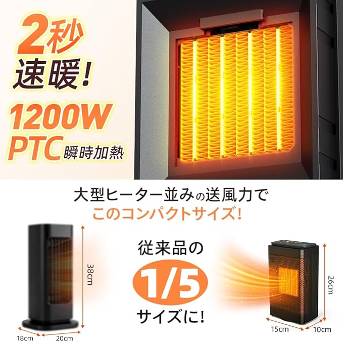 【2秒速暖・高効率PTCセラミック加熱】 セラミックヒーター 電源を入れてわずか2秒で温風が吹き出す即暖設計。高品質 PTC セラミック ヒーター を採用し、安全性・耐久性・省エネ性をすべて兼ね備えています。発熱効率が高く、冷え切った朝や帰宅後もすぐに心地よい暖かさに包まれ、待ち時間ゼロの快適さを実現する 電気ヒーター です。 ファンヒーター 電気式より省電力で、部屋全体をムラなく均一に暖めます。さらに長寿命設計により長期間使用しても性能が安定。小型ながら1200Wの強力出力で、脱衣所やオフィスなど狭い空間から6畳程度の部屋までしっかり暖房。寒い冬の強い味方となる 小型ヒーター です。