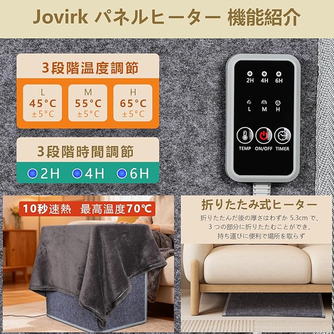 【Jovirkパネルヒーター 機能紹介】私たちパネルヒーター 足元は、寒い冬でもすぐに足元からぽかぽかになれる秒速加熱設計で、わずか10秒で最高温度70℃まで加熱します。折りたたみ式ヒーター厚さわずか5.3cm-6.3cmのコンパクト設計で、パネルヒーター 、収納や持ち運びも便利。軽量で場所を選ばず、リビングやオフィス、寝室などどこでも手軽に暖かさを楽しめます。
