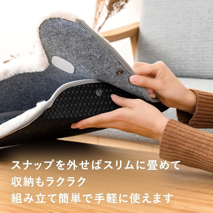 ふわふわのファーをあしらい、見た目から温かい折りたたみフットパネルヒーター。軽量・薄型ですっきり、スナップを外せばスリムに畳めて収納もラクラク。無音・無風で乾燥知らず。組み立て簡単で手軽に使えます。