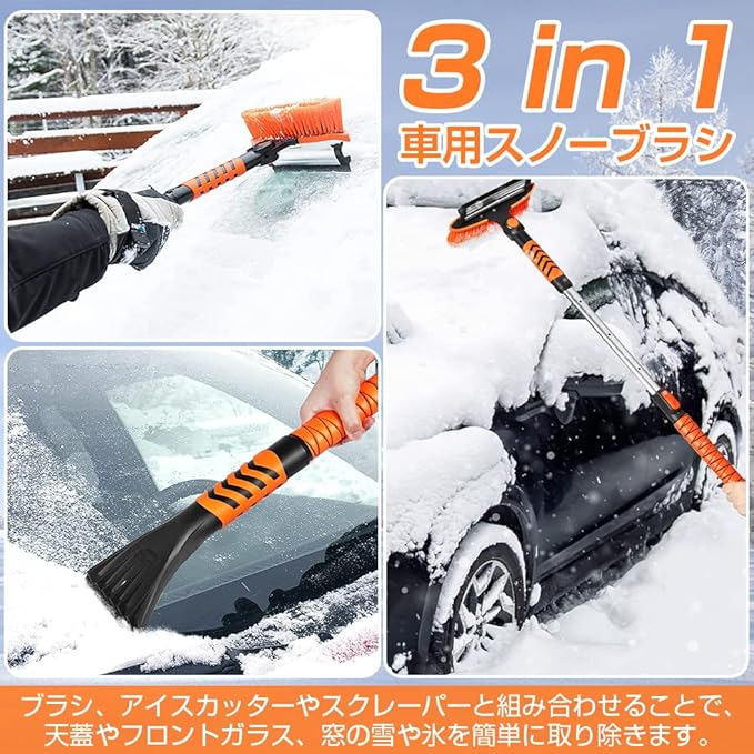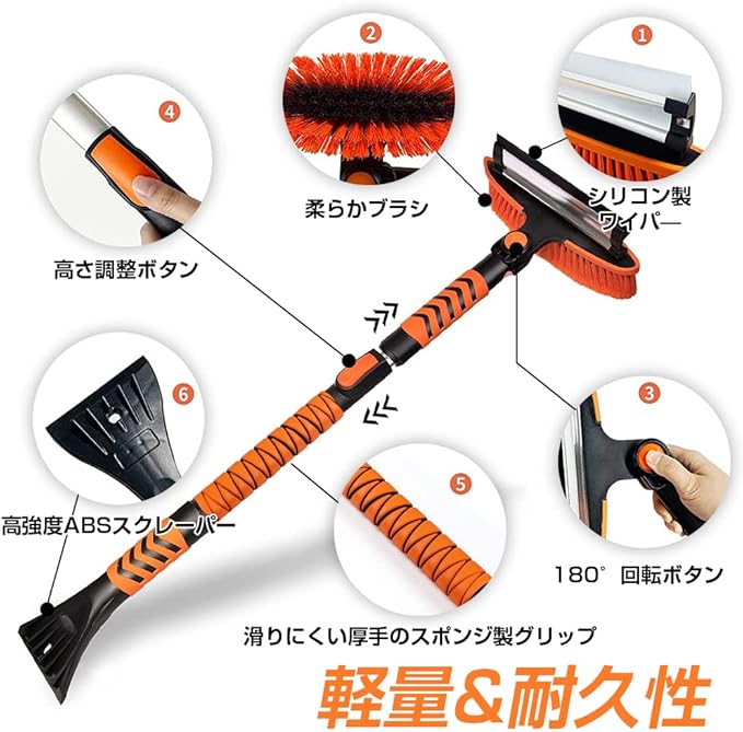 [ブラシ角度調整可] 高密度で太いブラシが雪を素早く除去し、時間と労力を節約します。ブラシのボタンを押すと、ブラシの角度を調整できる。ブラシのもう一方の端はシリコン素材で、ガラスを傷つけず、除污や排水に便利です。