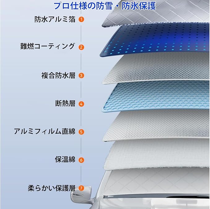 【保護範囲を拡大した自動車カバー】フロントカバー 凍結防止シートは従来の防雪カバーより大型で、サイズは240 220cm。7層構造の厚手生地(防水外層+保温内層+柔らかい傷防止裏地)を採用し、雪・氷・紫外線を遮断。厳しい冬でも愛車を安全に守ります。
