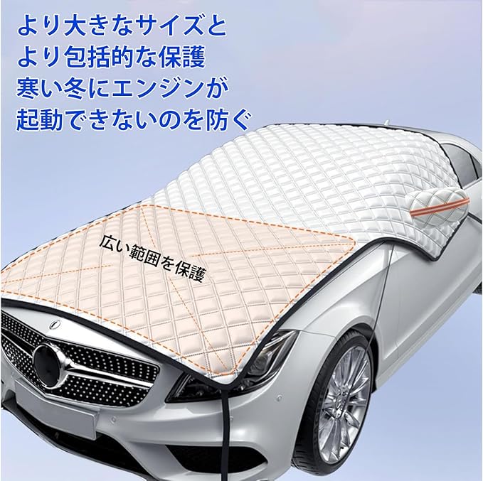 【全天候型保護】この自動車フロントガラスカバーは四季を通じて使用可能です。夏場は紫外線を遮断し、日光による車内部品の劣化を防ぎます。春・秋には落ち葉、ほこり、鳥の糞などが車に付着するのを防止し、清掃の手間を軽減します。冬場は霜や凍結から車を守り、素早いエンジン始動を可能にし、待つ必要がありません。