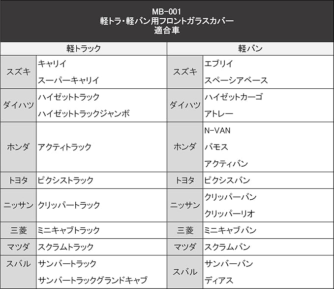 【スズキ】: エブリイ、エブリイワゴン、スペーシアベース、キャリイバン 【ダイハツ】:ハイゼットカーゴ、ハイゼットデッキバン、アトレー、アトレーワゴン 【HONDA】:N-VAN、バモス、アクティバン、バモスホビオ、バモスホビオバン、ストリート 【トヨタ】: ピクシスバン 【日産】:NV100クリッパー、NV100クリッパーリオ、クリッパーリオ、クリッパー 【三菱】:ミニキャブバン 【マツダ】: スクラム、スクラムバン 【SUBARU】:サンバートラック、ディアスワゴン、サンバーディアスワゴン、サンバーオープンデッキ 等
