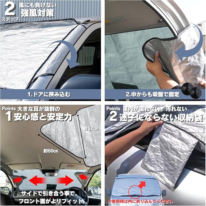 【吸盤で取り付け簡単!収納袋一体型】製品を広げ両サイドをお車のドアに挟み込み、フロントガラス内側に吸盤で固定します。使用後は十分に水分を拭き取り、エコバッグ同様に折り畳んでフロントガラスカバーと一体になっている袋に収納するだけです。 ※取付方法はページ下部の「HOTによる説明」、「商品の説明」、「動画」をご確認ください。