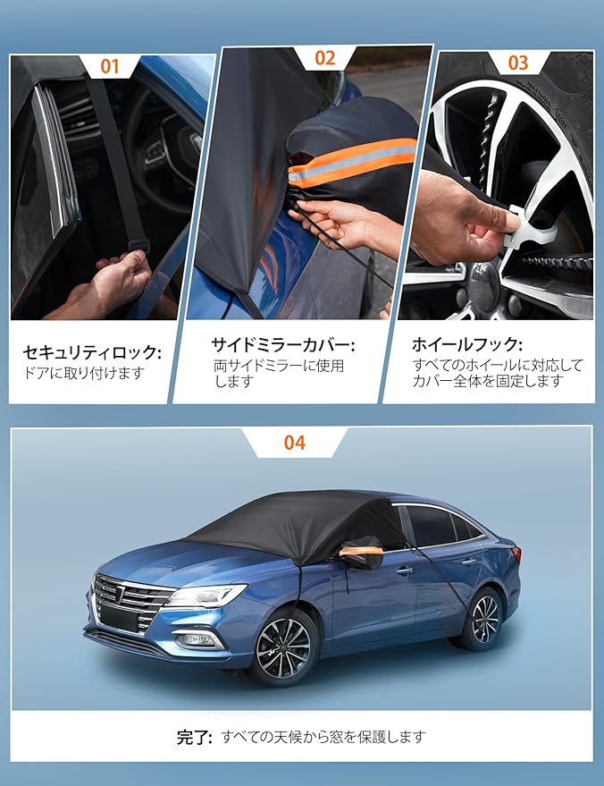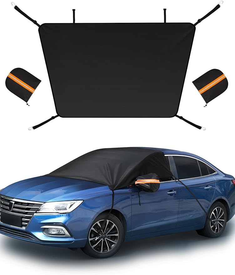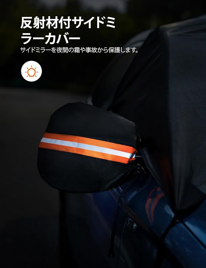 冬に強い保護機能:220 x 140 x 180cm、広い範囲をカバーしてフロントガラス、ドアの窓、ワイパーの保護機能を強化。PEVA素材、100%撥水、不織綿のライニングが表面を傷から保護します。フロントガラスカバーは氷や雪だけではなく、雨、霜、日光、ほこり、落ち葉、鳥のフンなどから保護します。