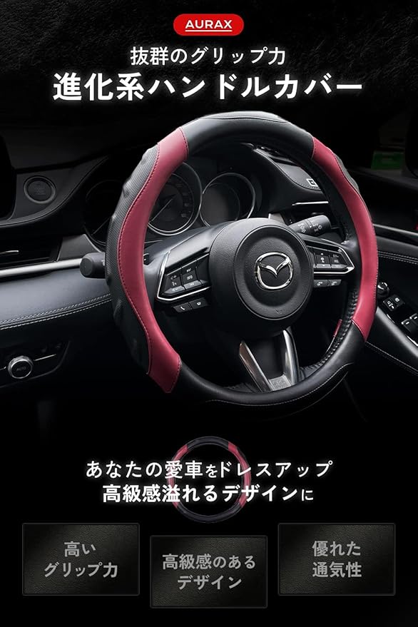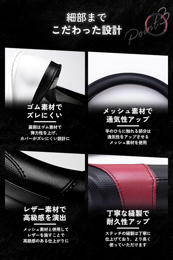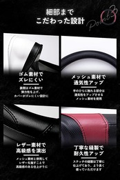 高いグリップ性で疲れにくいハンドルカバー。手の形にフィットする凹凸でグリップ力UP!長時間運転しても疲れや蒸れを感じることはありません。高級感溢れるスタイリッシュなデザインと機能性を両立。メッシュ素材とレザーを併用し、高級感と通気性の高さを実現。ハンドルを握る部分はメッシュ素材を使用しているため、肌にやさしく通気性に優れています。メッシュ素材を使用することで夏は蒸れにくく、通気性を上げています。寒い冬でハンドルが冷たくなる心配もありません。 【適用サイズ】円形(通常丸型)36.5~37.9cmに対応。ご購入の際は実際のハンドル直径を測って、サイズをご確認の上ご購入ください。楕円形D型の車種は直径が一致しても、隙間がでる可能性がございます。例え、直径が一致してもおすすめしません。