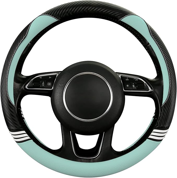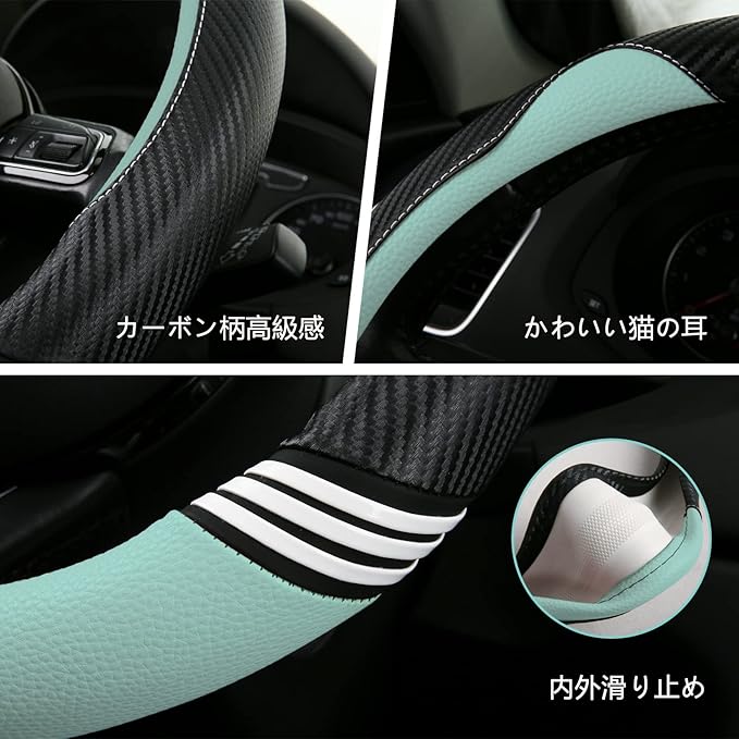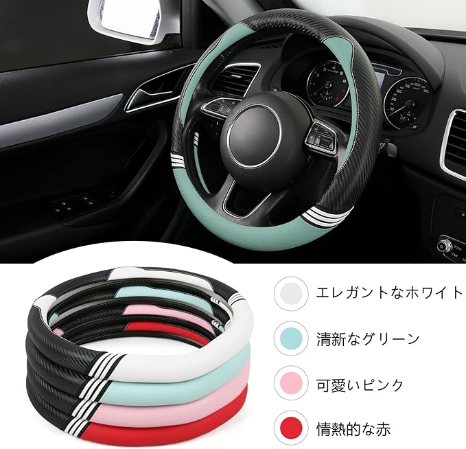 【手触りよし】カーボン柄とレザーのパッチワークでグリップ感がアップし、ハンドルの回しが楽になり、非常に持ちやすく、フィット感がバツグン、長時間の運転でも疲れになりにくいです