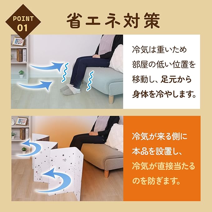 【冷気やすき間風をブロックするパネル】:窓際やドア付近、枕元などに立てておくだけで冷気やすき間風を防ぐパネル。