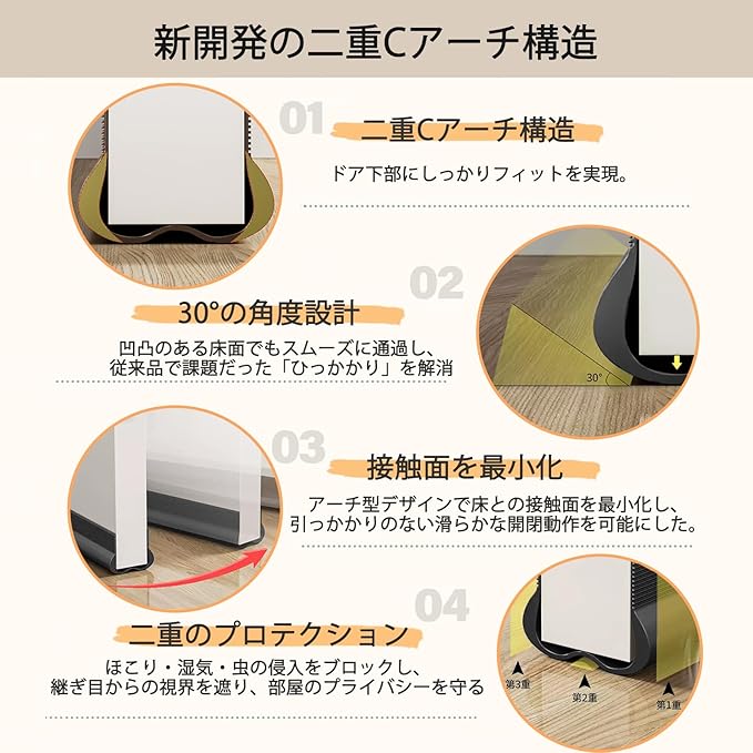【Cアーチ構造でドアの隙間ピタリ密着!】ドア隙間風防止ガードは独自開発の二重Cアーチ構造がドア下部にしっかりフィットを実現。アーチ型デザインで床との接触面を最小化し、引っかかりのない滑らかな開閉動作を可能にしました。30 の角度設計により、凹凸のある床面でもスムーズに通過し、従来品で課題だった「ひっかかり」を解消。ベタつかず床を傷つけない低摩擦構造でフローリング保護&スムーズな開閉を両立。ほこり・湿気・虫の侵入をブロックし、継ぎ目からの視界を遮り、部屋のプライバシーを守ることができます。