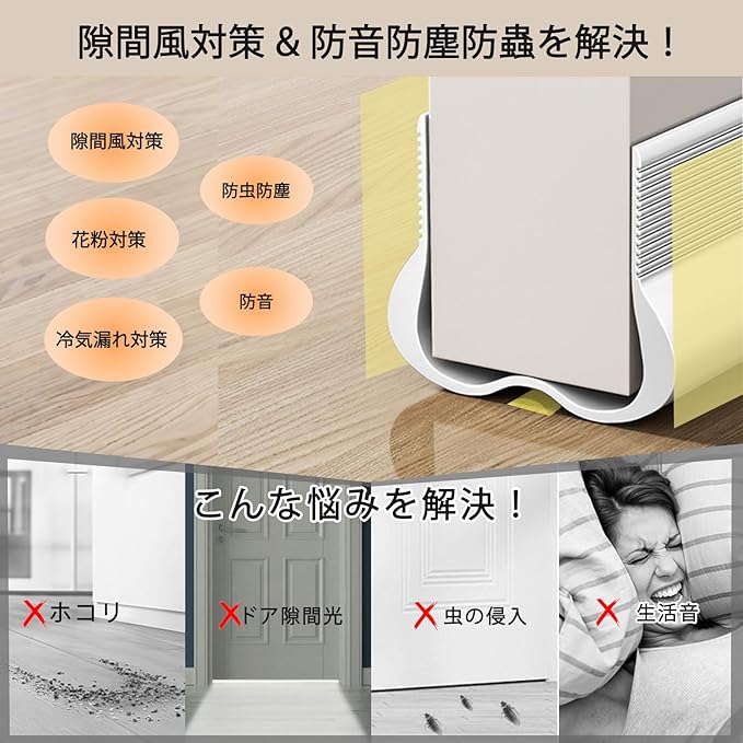 【隙間風対策 & 防音防塵防虫を解決!】ドア 隙間テープが四季の悩みを一掃!特殊高密度PVC隙間シールテープが隙間風・ほこり・虫の侵入をブロックしながら、防音効果で室内の静けさをキープ。冬の冷気も夏のエアコン冷房も逃さず、冷暖房効率UPで光熱費削減に貢献します。接着剤不要の簡単貼るだけ設計でドア開閉もスムーズ、耐久性に優れ長期間ご使用可能。柔らかい素材で敷居を傷つけず、ペットやお子様にも安心。玄関・室内ドア・引き戸に幅広く対応します。