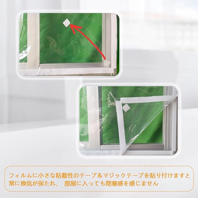 取り付けと取り外しは手軽で、冬用の窓断熱には風防フックアンドループファスナーが付いており、フレームにしっかりと密着します。ドリルツールは不要で、簡単に取り付け可能です。ウィンドウストラップを下げて通気口を開けることができます。