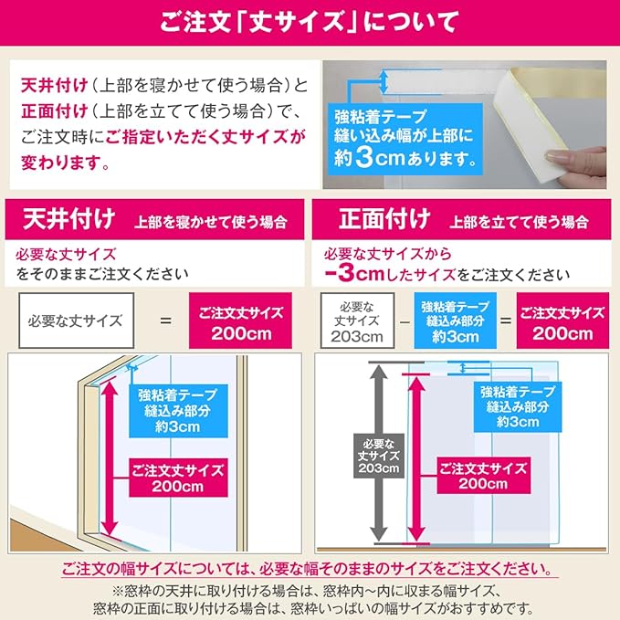※ご注文「幅サイズ」について:必要な幅そのままのサイズをご注文ください。 ご注文「丈サイズ」について:天井付けの場合、必要な丈サイズをそのままご注文ください。正面付けの場合、必要な丈サイズから-3cmしたサイズをご注文ください。