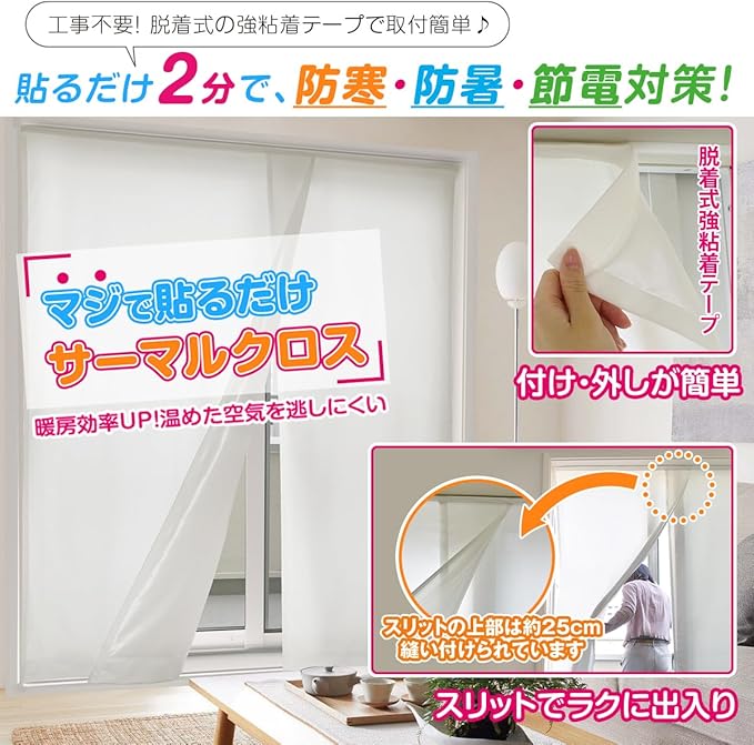 「マジで貼るだけサーマルクロス」は窓枠等に取り付けることで、防寒・防暑・節電対策や目隠しになる商品です。脱着式強粘着テープで付け外しが簡単・またスリット入りで出入りや窓の開閉にも便利です。