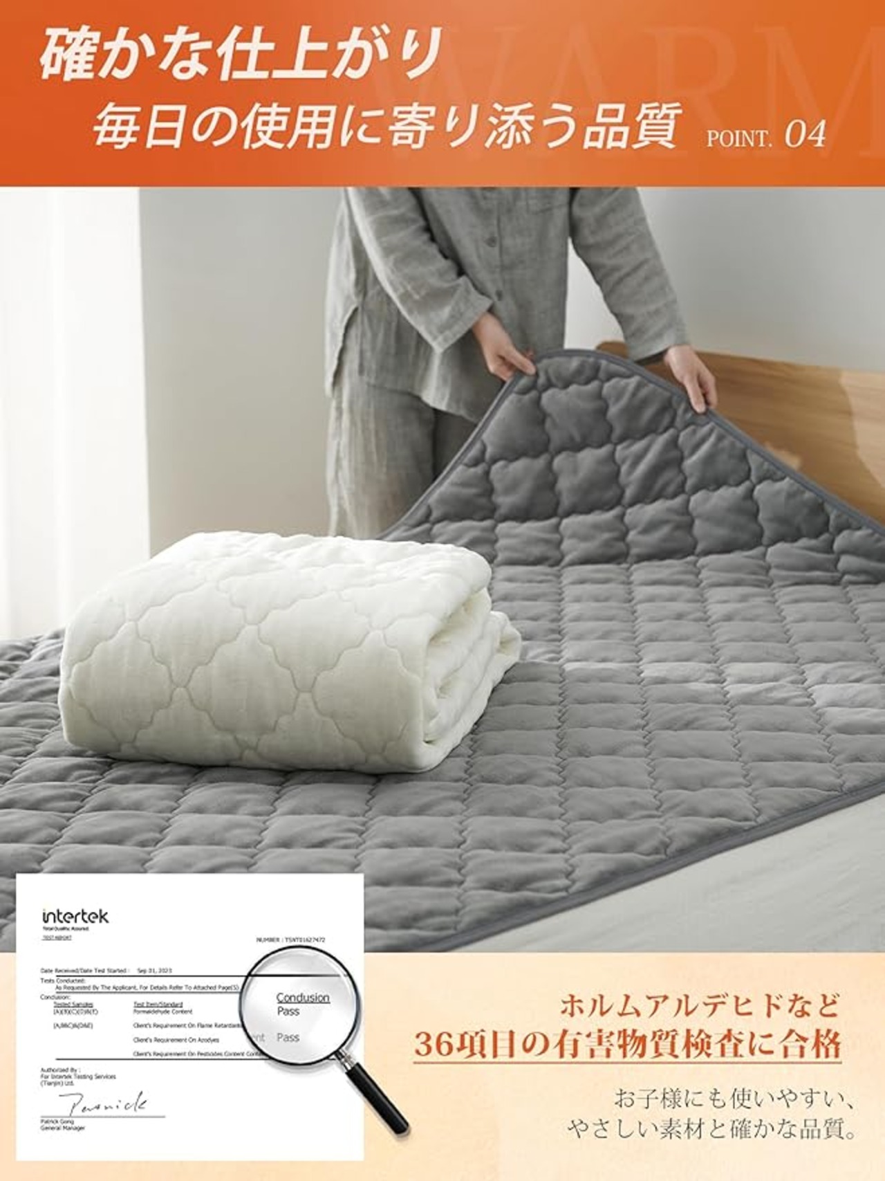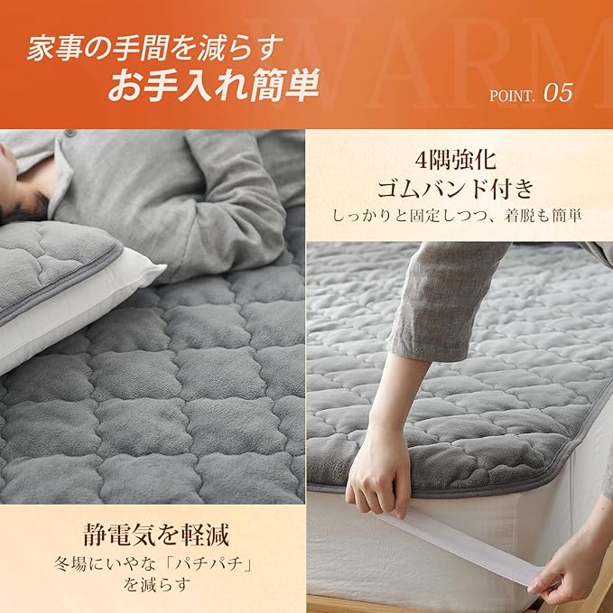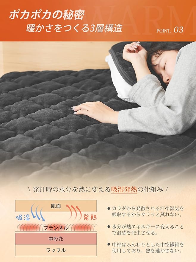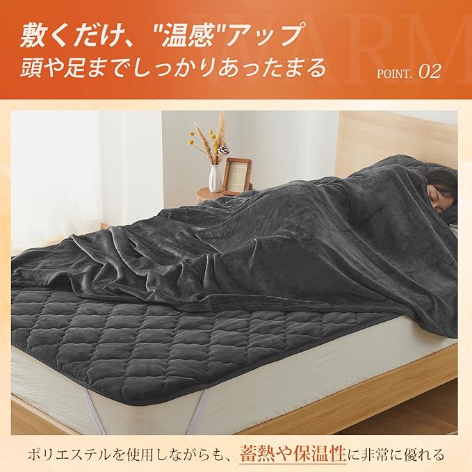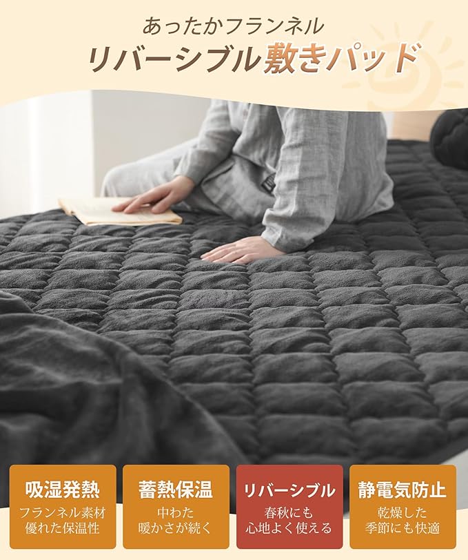 「持続温感敷きパッド」フランネル面は柔らかく、厳冬でも布団に入る瞬間にヒヤッとしません。マイクロファイバーを使用しているため、細かい繊維の間に空気を取り込み、暖かい空気を逃がさずに保ちます。さらに、蓄熱中ワタは体から発生する湿気を熱に変え、持続的な暖かさを実現します。