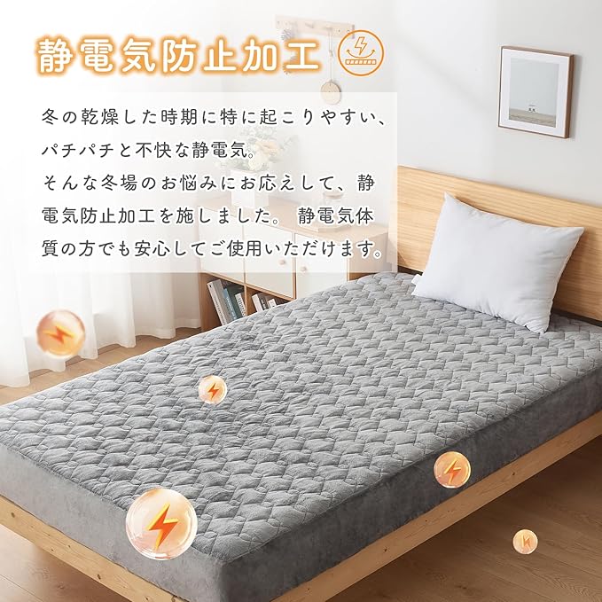 【静電気を抑える特殊加工】冬の乾燥した時期に発生しやすい静電気を軽減する特殊加工を施しています。化学繊維が苦手な方にも配慮し、就寝時の不快なパチパチ感をやわらげて快適性を向上。※静電気の発生を完全に防ぐものではありません。