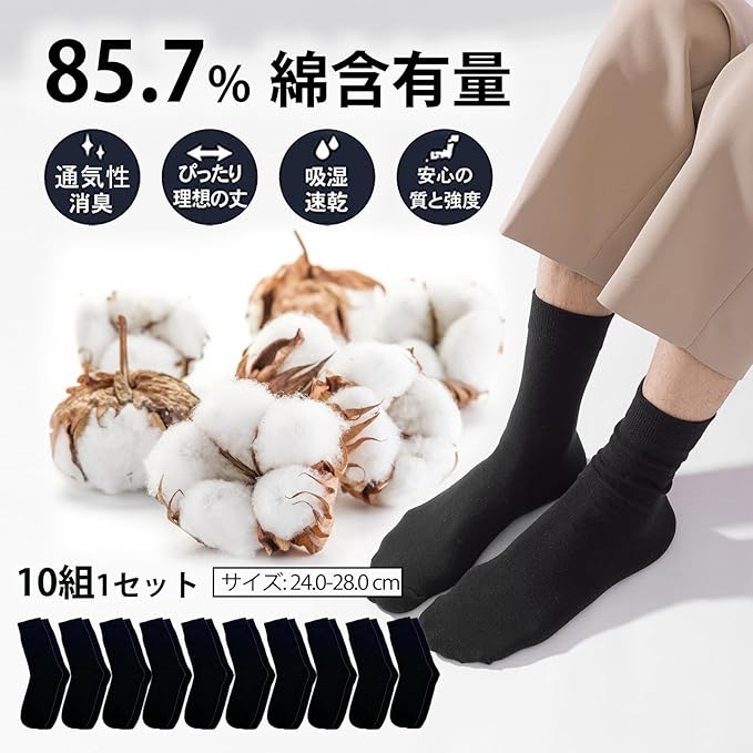【快適な綿素材】靴下 メンズは85.7%の高品質コットンコーマ混紡素材を採用。軽量で柔らかな肌触りを実現しました。滑らかな平編み構造が足裏の通気性を保ち、汗を素早く発散させるため、一日中ムレにくく、臭いの発生を抑えます。