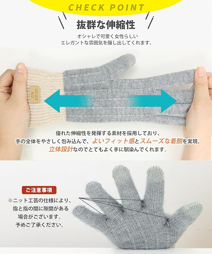 【程よいフィット感】伸縮性に優れたニット生地のおかげで、指の曲げ伸ばしに追従し、手にしっかりフィットし、手の動作を邪魔しない手袋。締め付け感がなく、指先まで包み込まれるような着用感です。レディース手袋は手首のリブタイプが程よいフィット感のため、寒い空気をしっかり防いでくれます。軽量かつ高い防風性のある手袋は、簡単にバッグに収納でき、寒い冬に欠かせない防寒アイテム。
