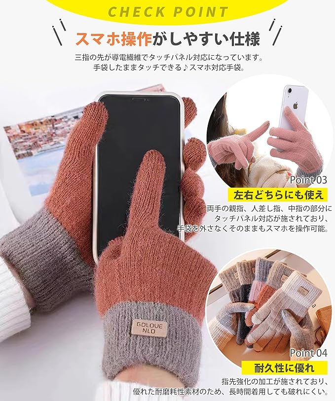 【防寒手袋・保温性倍増】上質な生地で、柔らかな風合いと包み込まれるレディース手袋。手袋の裏側にふわふわした起毛が施されており、着けた瞬間から暖かさを感じます。防寒手袋としての抜群な保温性はもちろん、汗をかいても蒸れにくい吸湿性や高い耐久性に優れています。通勤、通学、お出かけ、ショッピングなどの場合に普段使えるレディース手袋。寒いアウトドアシーンでも重宝するスマホ対応手袋。