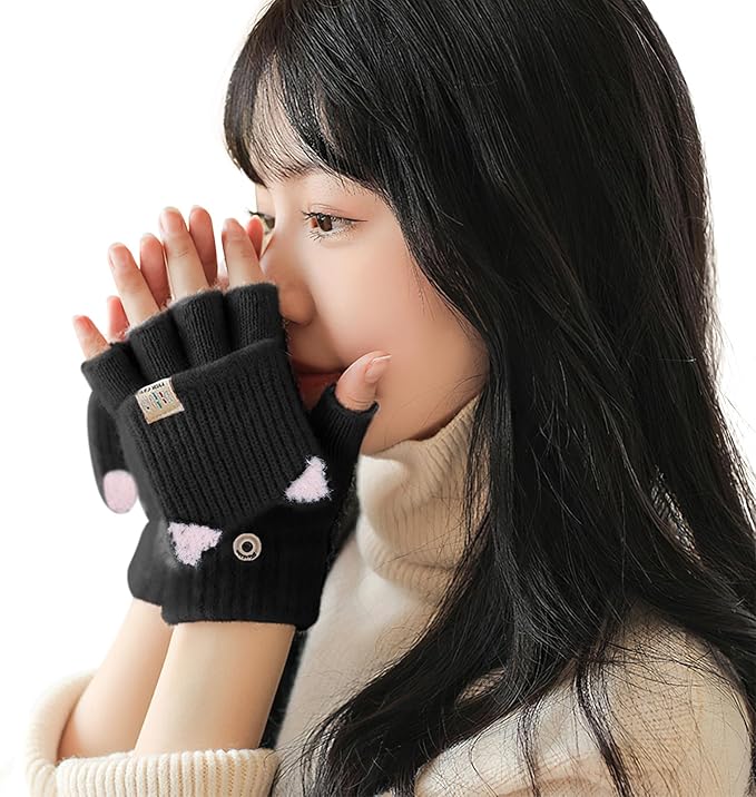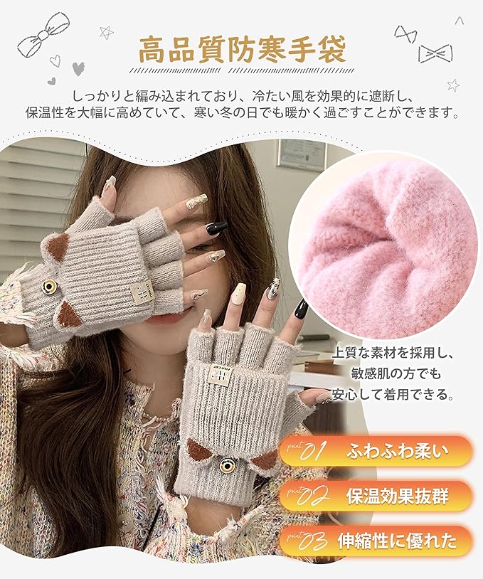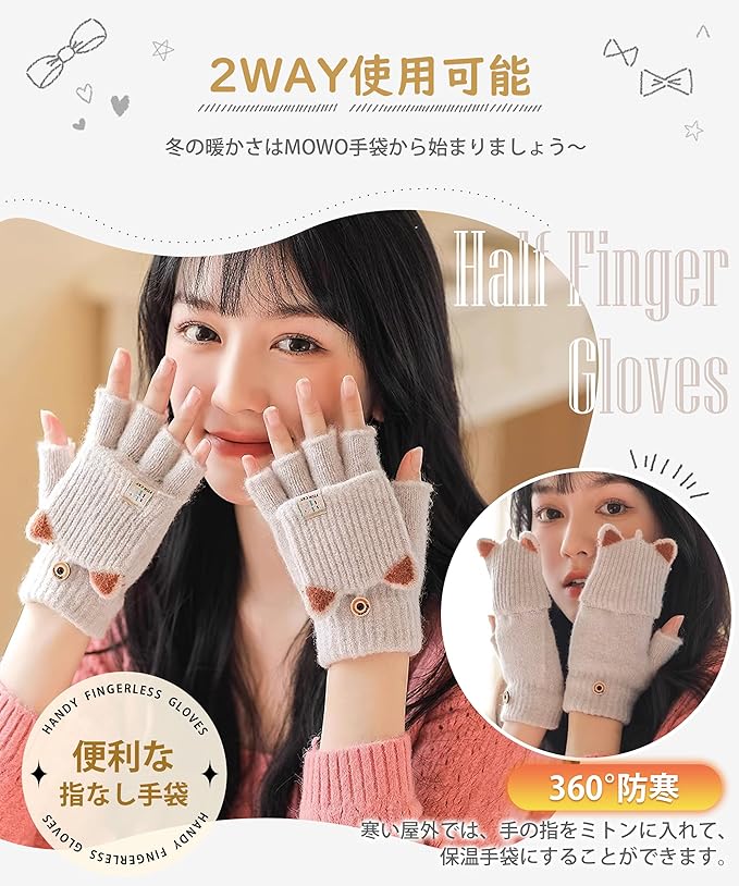 [MOWO] 手袋 レディース 指なし手袋 【ふわふわ柔い・保温効果に 寒風ガード袖口】 冬 指出し レディース手袋 ミトン ニット製 フード手袋 半指手袋 厚手 暖かい かわいい スマホ対応 防寒防風 2WAY プレゼント 自転車 通勤・通学 旅行 | etshop