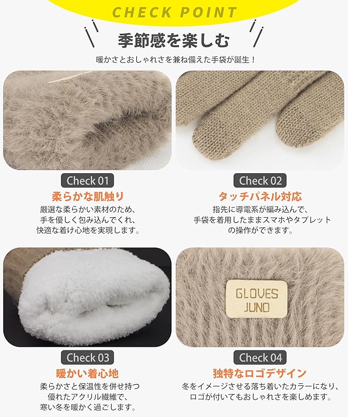 【冬のムードへ】独特なロゴが付いているレディース手袋、可愛いすぎなく、カジュアルすぎなく、絶妙なファッション感!ブラック、グレー、カーキ、ベージュ、ピンクなどの冬の雰囲気に仕上がっているレディース手袋、どんなコーディネートに合わせやすい。普段の使いから通勤時など幅広い使える防寒手袋。プレゼントにもおすすめのスマホ対応手袋。