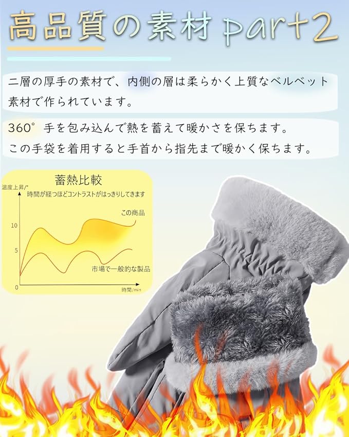 【高品質の素材】二層の厚手の素材で、表面層は優れた防水性と耐摩耗性を備えた高品質のポリエステル繊維で作られており、内側の層は柔らかく上質なベルベット素材で作られています。この手袋を着用すると手首から指先まで暖かく保ちます。