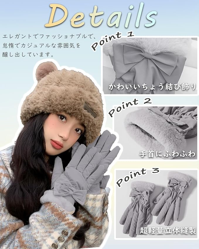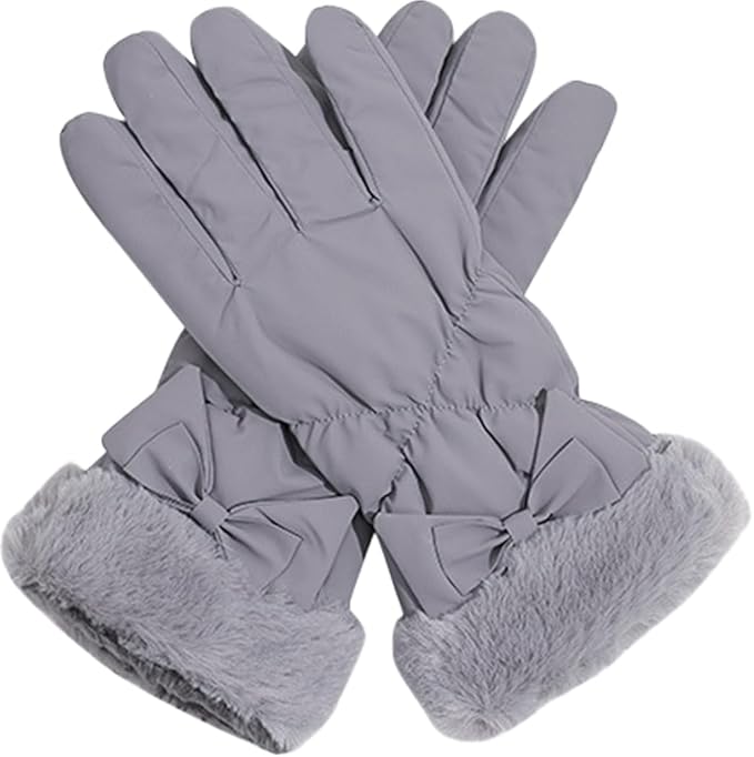 【ユニークなデザイン】立体的な裁断と成型により、手の形にぴったりフィットします。同色のリボンが付いた無地デザインがシンプルで可愛いです。手首ふわふわ、快適で暖かいです。
