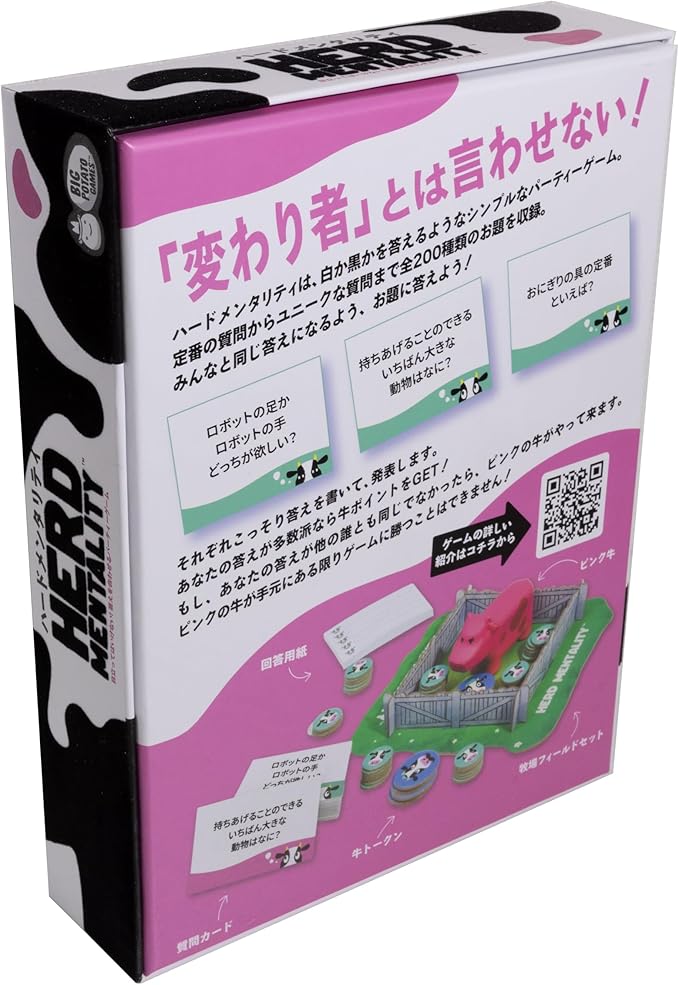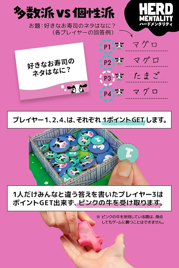 ✅【 みんなの答えと同じになる!? 】プレイヤーはお題に答え、他のプレイヤーと答えと一致させる(多数派になる)ことでポイントを獲得します。最初に8ポイントを獲得した人が勝者となりますが、ユニークな「ピンクの牛」ルールにより、勝利が簡単には決まりません。