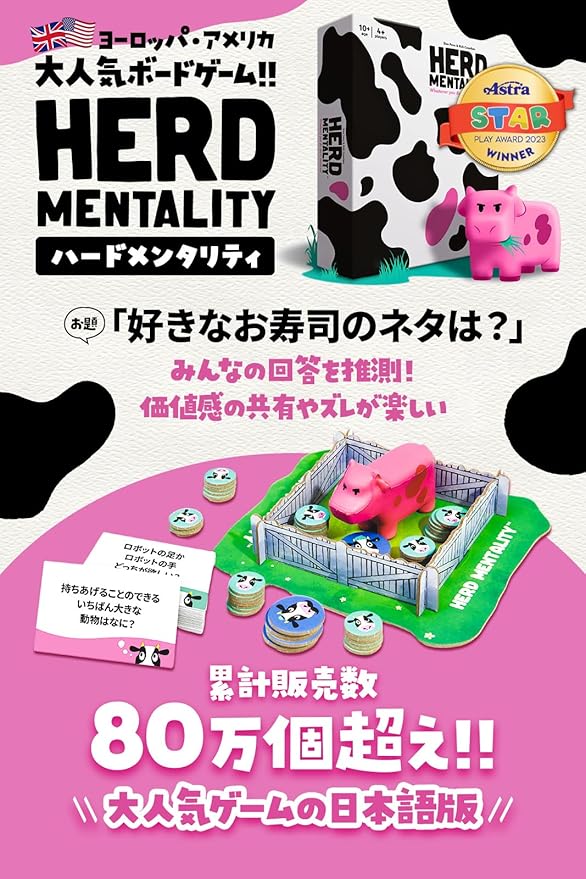 ✅【 遊びココロ溢れるデザイン 】心理学で有名な群衆の心理がテーマの本作、そのモチーフとるウシと牧場をカワイク設計。パッケージから1つ1つのパーツまでゲームを盛り上げる仕組みがたくさん。 ピンク牛(ふにふに素材)、フィールドセット、カード100枚(表・裏お題200個)、回答用紙50枚、トークン、ルールブック