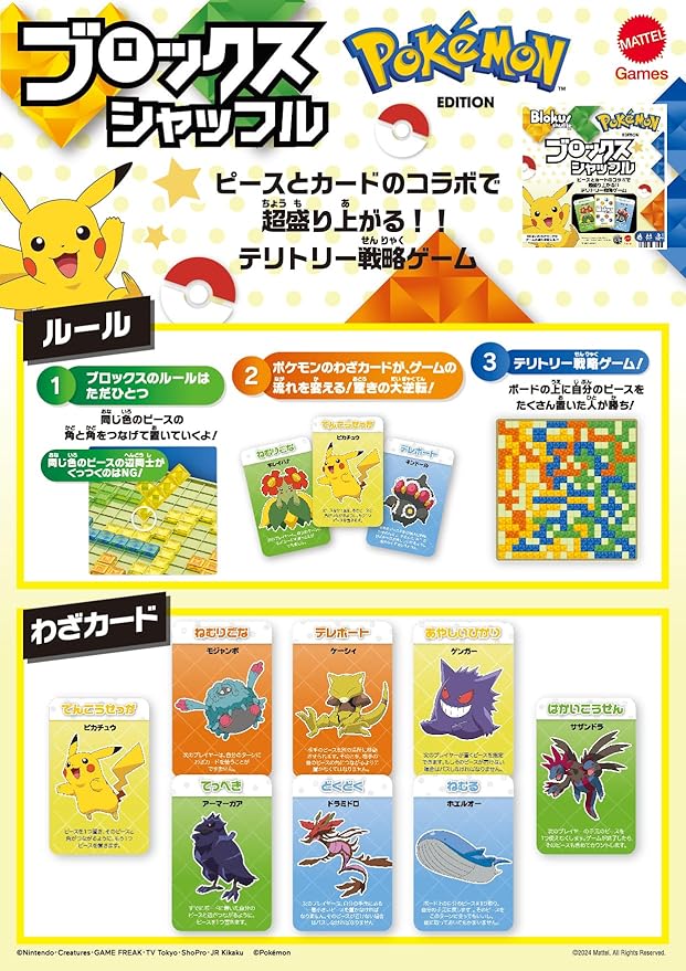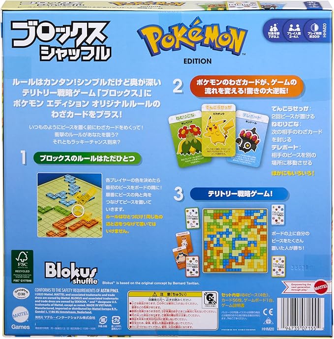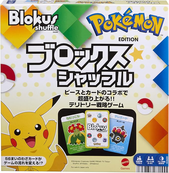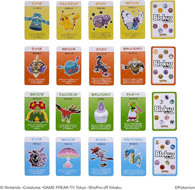 【内容】ルールはカンタン!シンプルだけど奥が深いテリトリー戦略ゲーム「ブロックス」にポケモン エディションが登場!オリジナルルールのわざカードをプラス!いつものようにピースを置く前にわざカードをめくって!衝撃のルールがあなたを襲う?それともラッキーチャンス到来?Blokus is based on the origial concept by Bernard Tavitian.Nintendo・Creatures・GAME FREAK・TV Tokyo・ShoPro・JR Kikaku Pok mon
