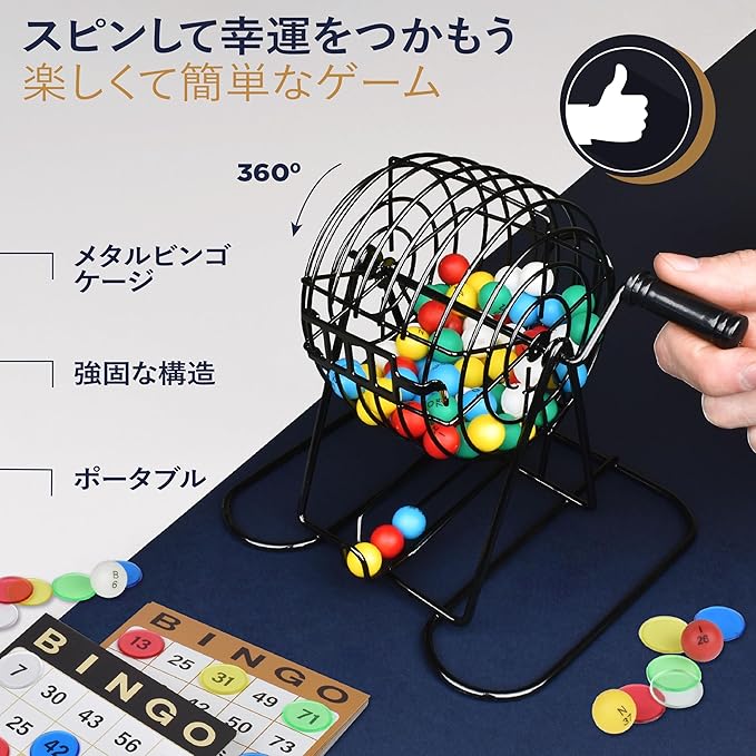 [価値]: メタルビンゴケージ、75個の番号付きボール、プラスチックボード1個、両面ビンゴカード50個、ビンゴマーカー300個、フルカラーの詳細な説明書が付属するビンゴセットでゲームを始めましょう。