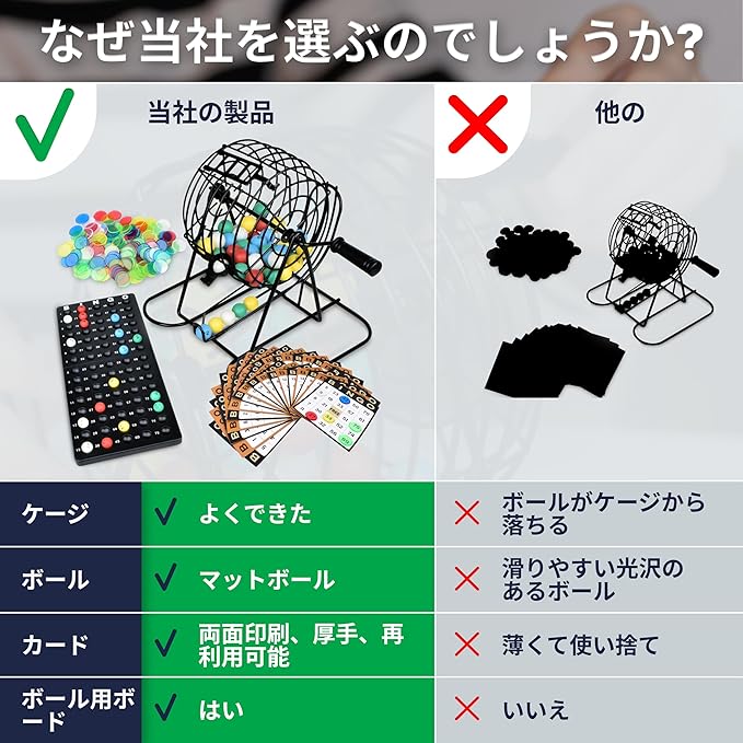 [最高品質]: 優雅さを醸し出す高品質のビンゴセットで、大人のビンゴゲームを高めましょう。 ビンゴケージとボールセットは、繰り返し遊んでもこすれない明るいマーキングが刻印されています。