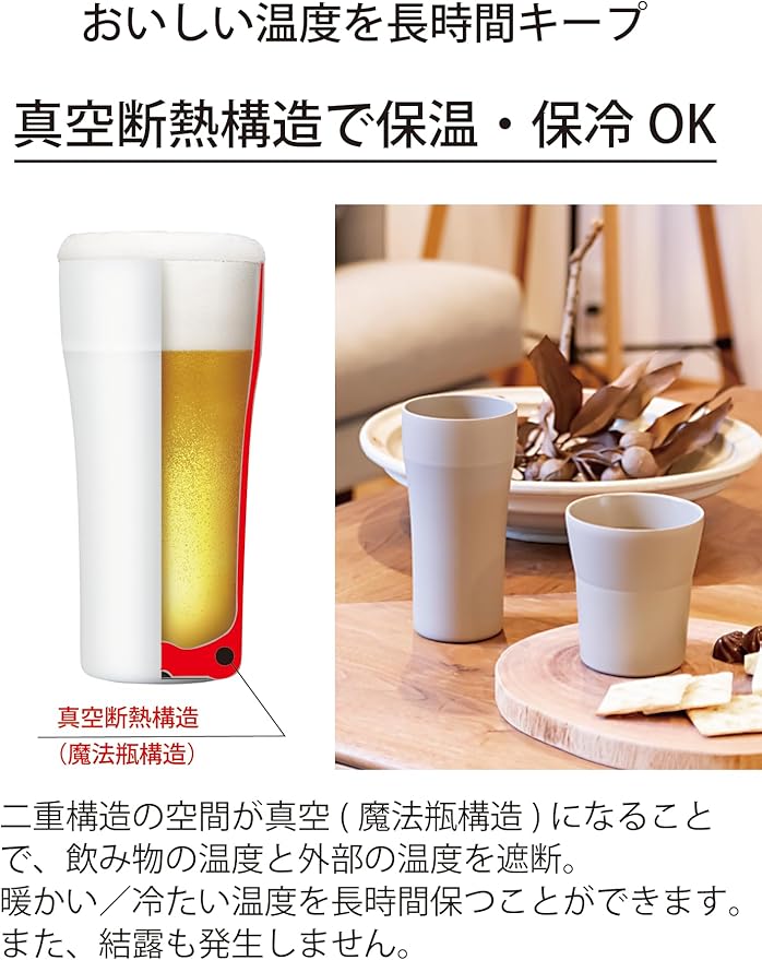 【真空断熱構造】ステンレス製真空断熱構造 (魔法瓶構造) で保温・保冷を長時間キープ。氷を入れても結露せず、暖かい飲み物を入れても本体が熱くならない