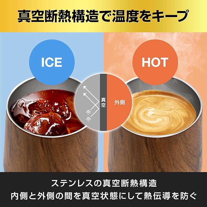 【真空断熱構造】 外壁と内壁の間が真空で熱が伝わりにくく保温保冷効果に優れています。 冷たい飲み物は冷たいまま、熱い飲み物は冷めにくく飲みごろの温度を長く保てます。