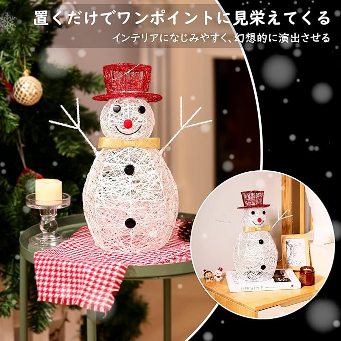 「幻想的に演出」雪だるま表面には複数のLEDライトつきワイヤーで巻かれており、3本のAA電池とUSB給電の2つ可動させる扱いやすい簡単な仕組みより、スイッチを入れるだけで、すぐに柔らかい輝きを放ち、お部屋を幻想的に演出させ、ほんわかした灯りの中で、ゆっくりとした時間を過ごせます。